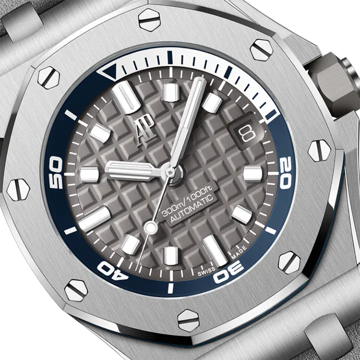 Grey dial with “Méga Tapisserie” pattern, white gold applied hour-markers and Royal Oak hands with luminescent coating, blue rotating inner bezel with zone from 60 to 15 minutes in white