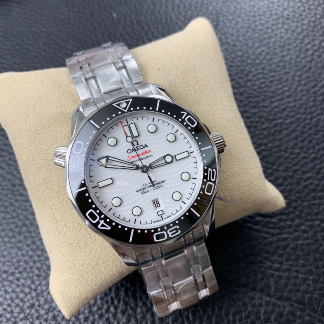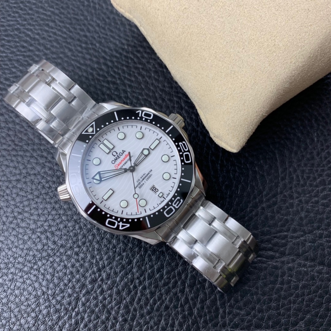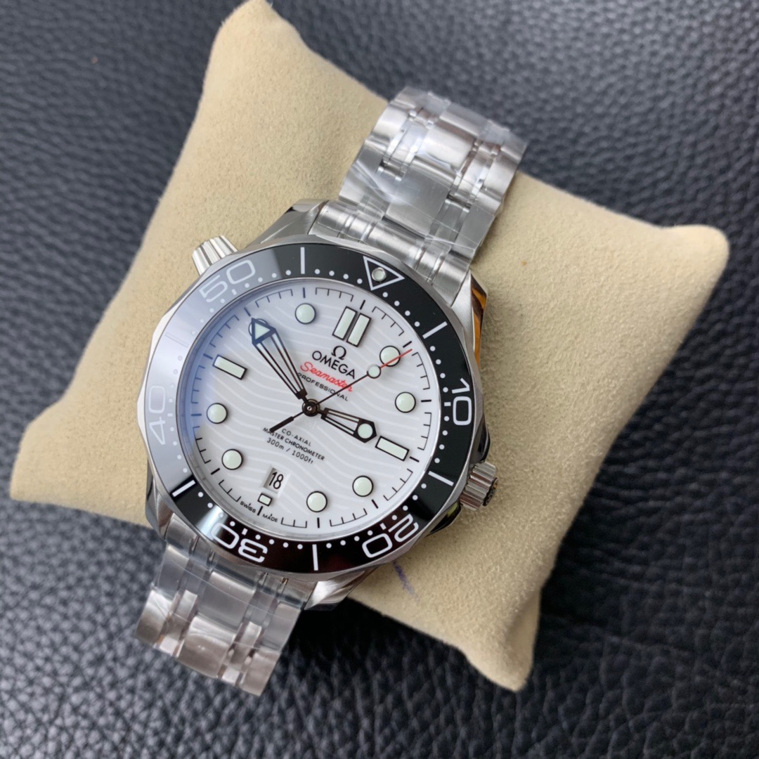 Made of stainless steel, this 42mm model features a black ceramic bezel and white enamel diving scale. The dial is crafted from polished white ceramic and features laser-engraved waves and a seahorse highlighted in red.
