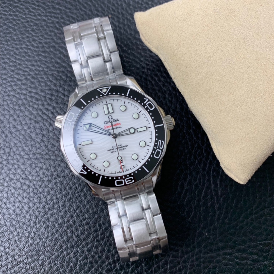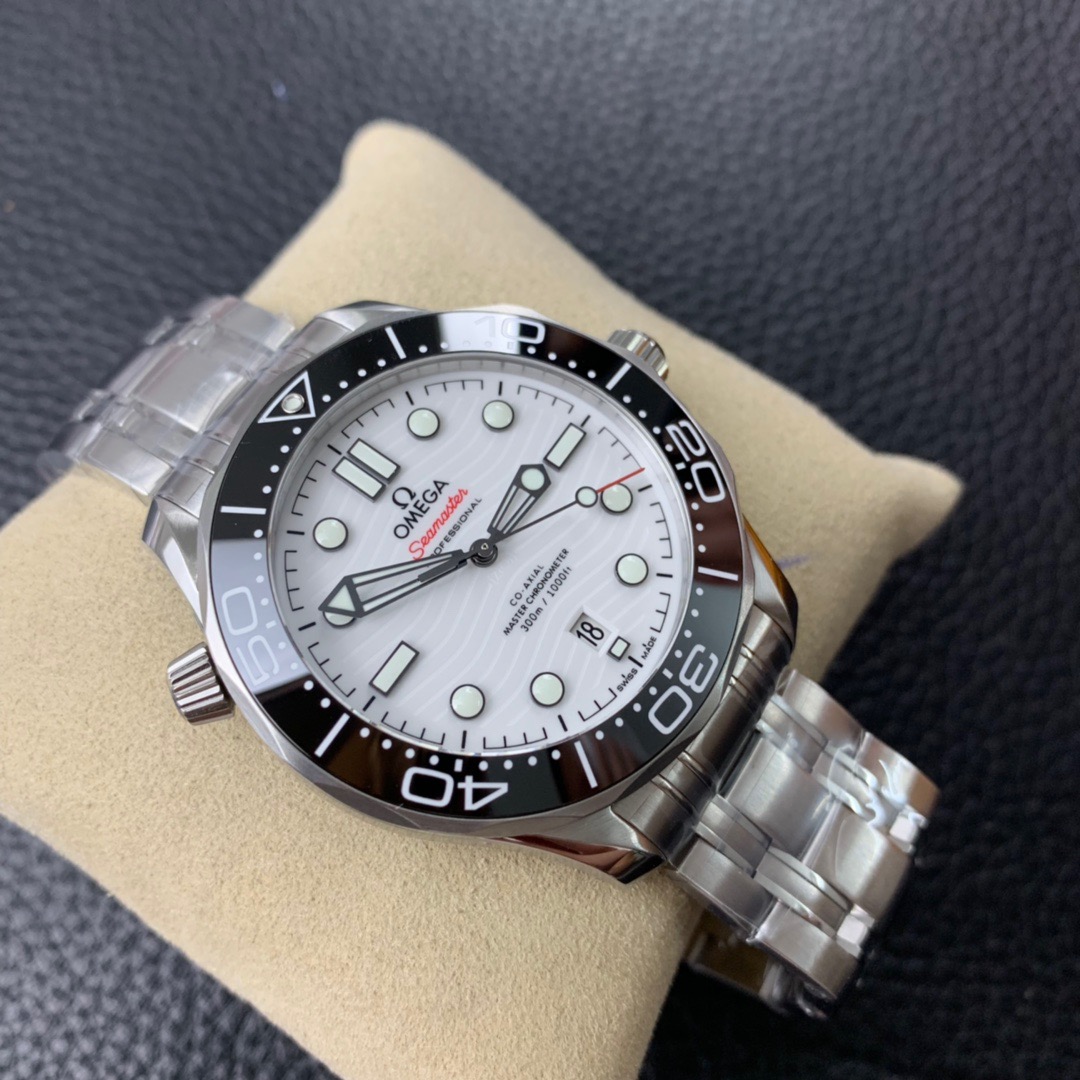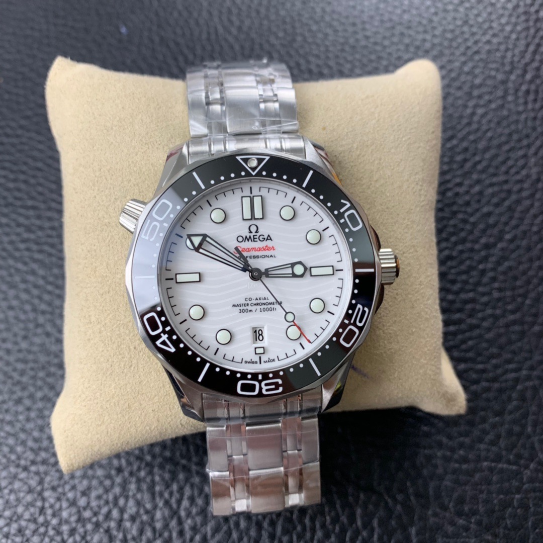 Made of stainless steel, this 42mm model features a black ceramic bezel and white enamel diving scale. The dial is crafted from polished white ceramic and features laser-engraved waves and a seahorse highlighted in red.