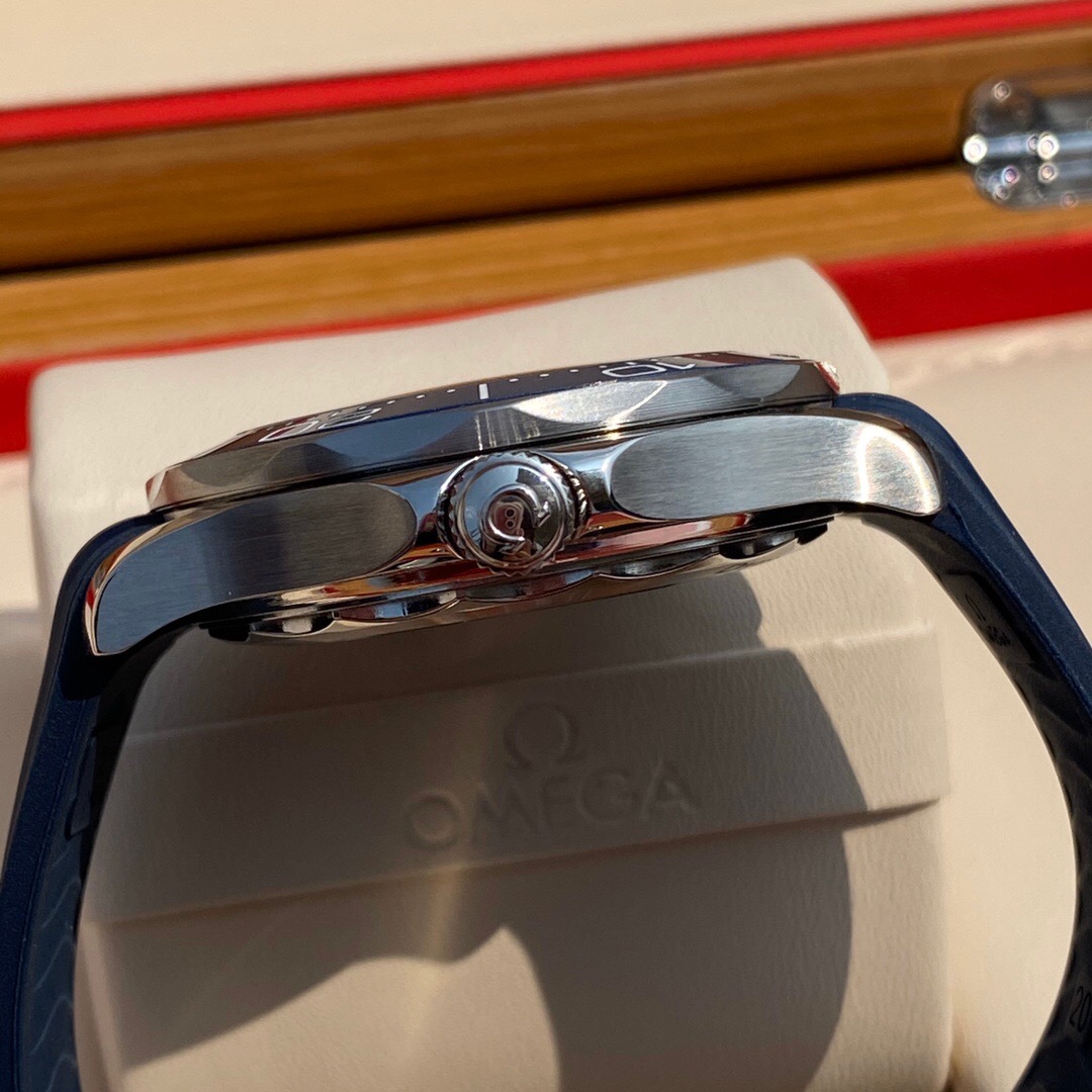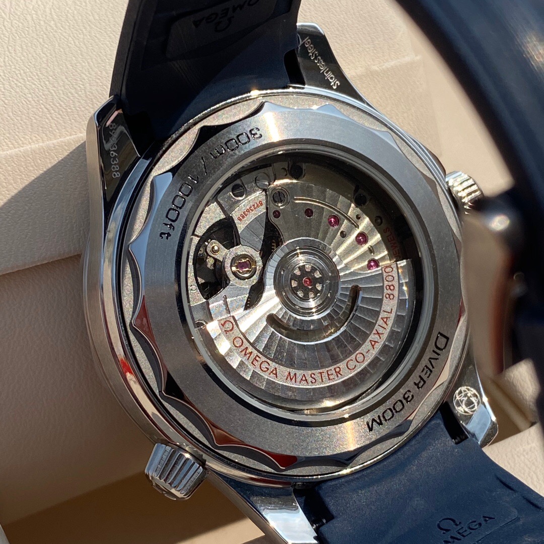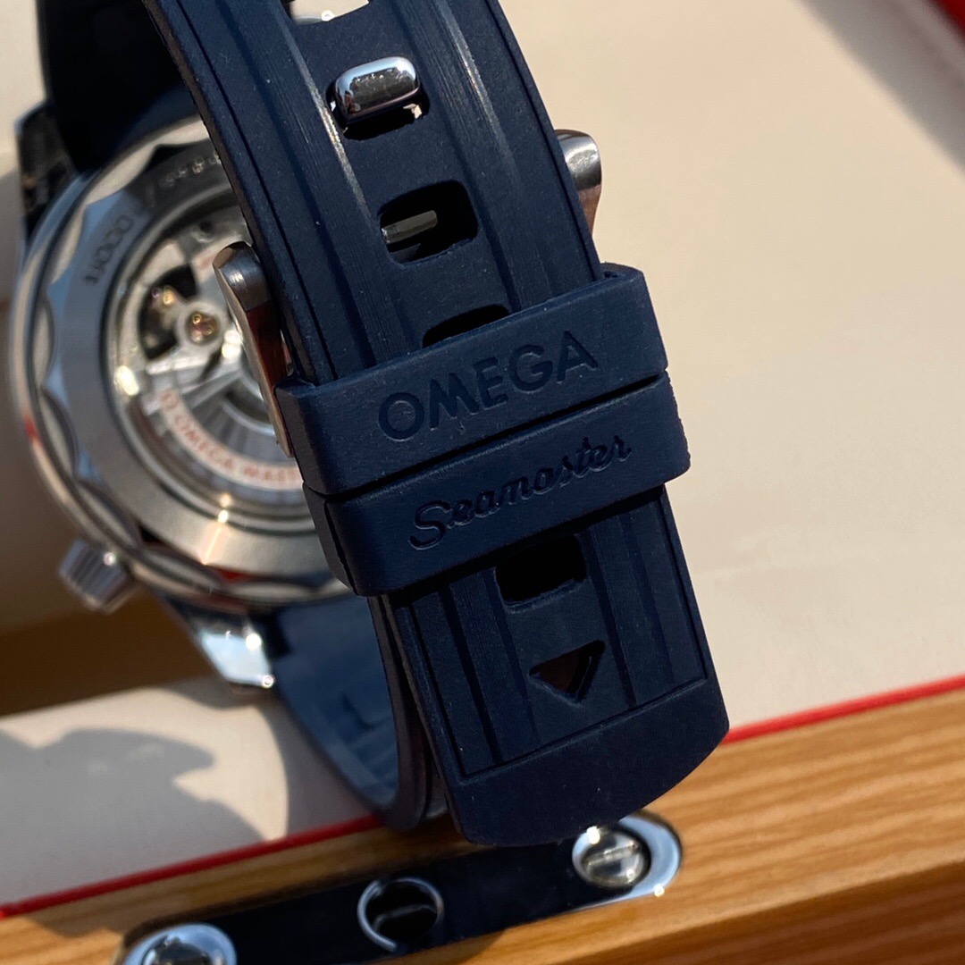 The watch is presented on a blue rubber strap and is driven by the OMEGA Master Chronometer Calibre 8800, which can be seen through the sapphire-crystal on the wave-edged caseback.